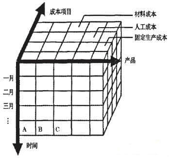 例如制造业的产品成本管理,如果只需要时期和成本项目两维的数据,则两维数据查询可以通过平面表格表示(如表1所示);如果需要三维以上的查询,则要用立体才可反映,如图4所示。