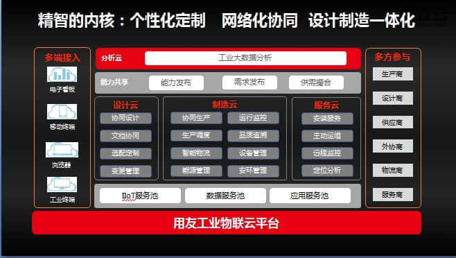用友精智有三大内核,即个性化定制、网络化协同和设计制造一体化。基于用友工业物联云平台,用友精智包含设计云、制造云和服务云,同时实现多端接入、多方参与。