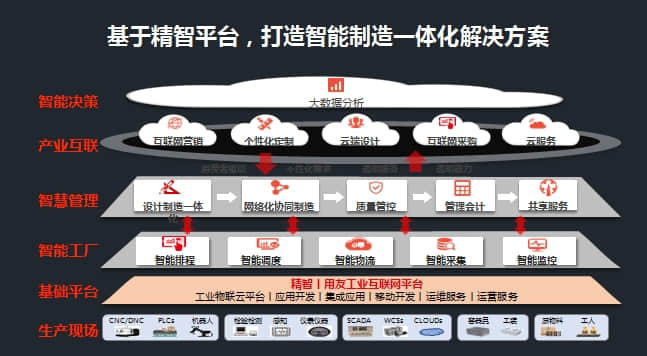 用友公司基于精智平台,打造了智能制造一体化解决方案,具体包括了生产现场、基础平台(用友精智)、智能工厂、智慧管理、产业互联和智能决策。